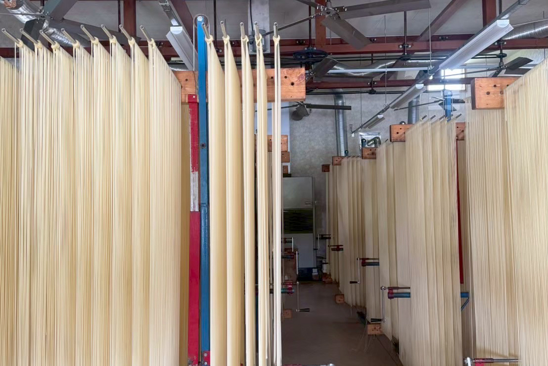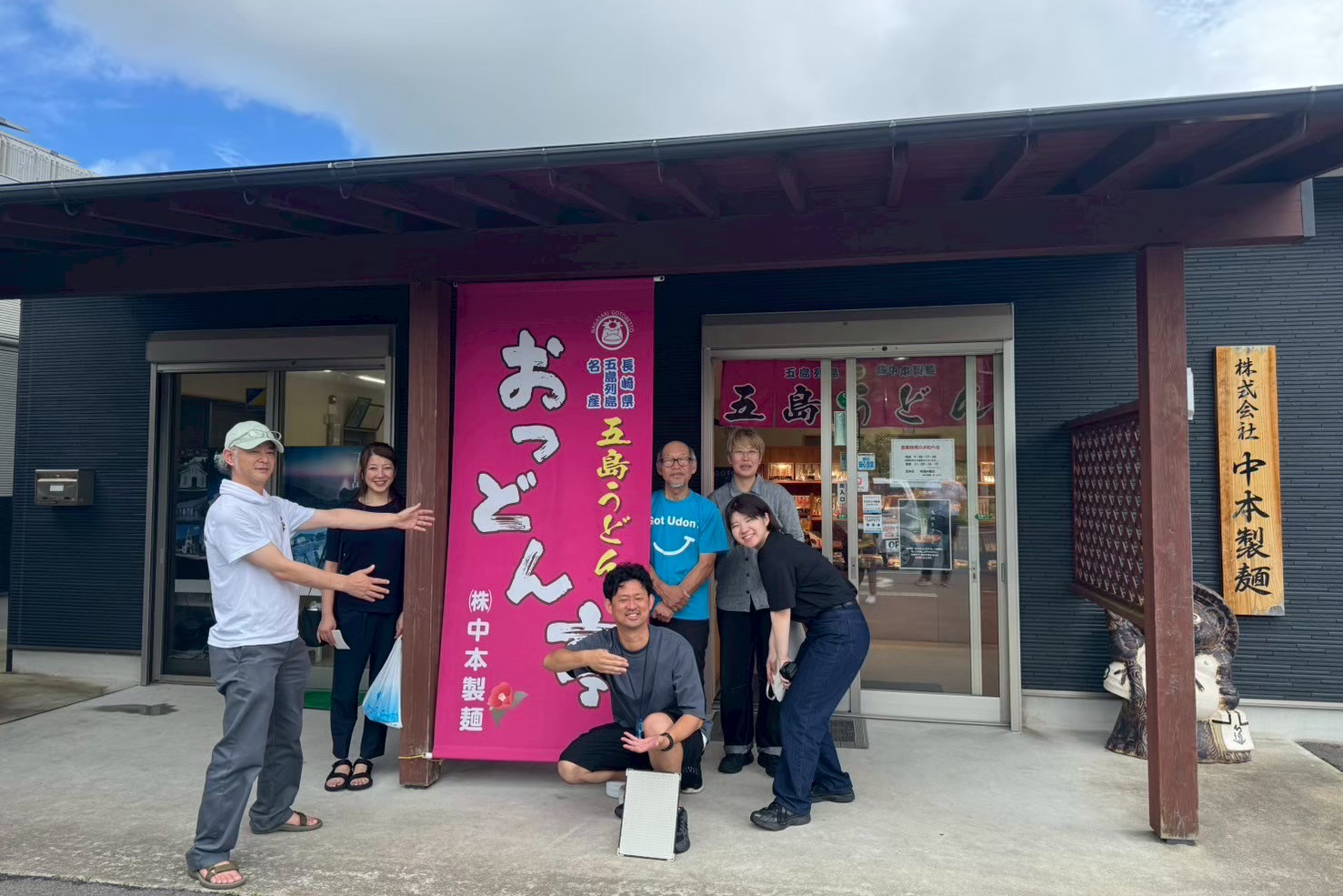 干されたうどんが陽の光をやわらかく受け止め、まるで繊細なカーテンのように揺れていました。その光景に見とれていると、ふと社長の中本茂さんが着ていた「GOT UDON」Tシャツが目に入りました。五島うどんにかけたその遊び心が中本さんのお茶目なキャラクターに合っていていいなと思いました。