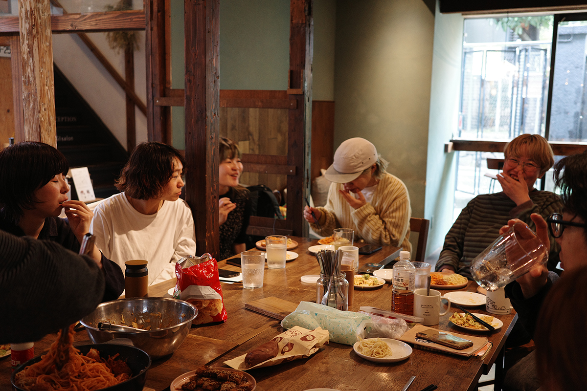 オフィスは千駄木駅近くのビルの2階です。建築設計や企画チームと一緒に、約13名ほどが同じ空間で働いています。個人のデスクとは別に作業台やミーティングスペースもあります。休憩は各自のペースでとっていますが、みんなで外に食べにいったり、キッチンで作る人もいます。お弁当を持ち寄ってカウンターを囲んで食べる風景もオフィスの日常です。