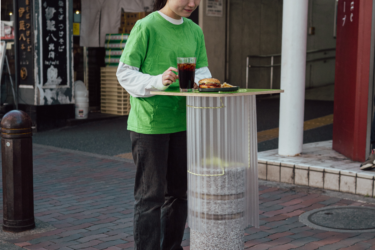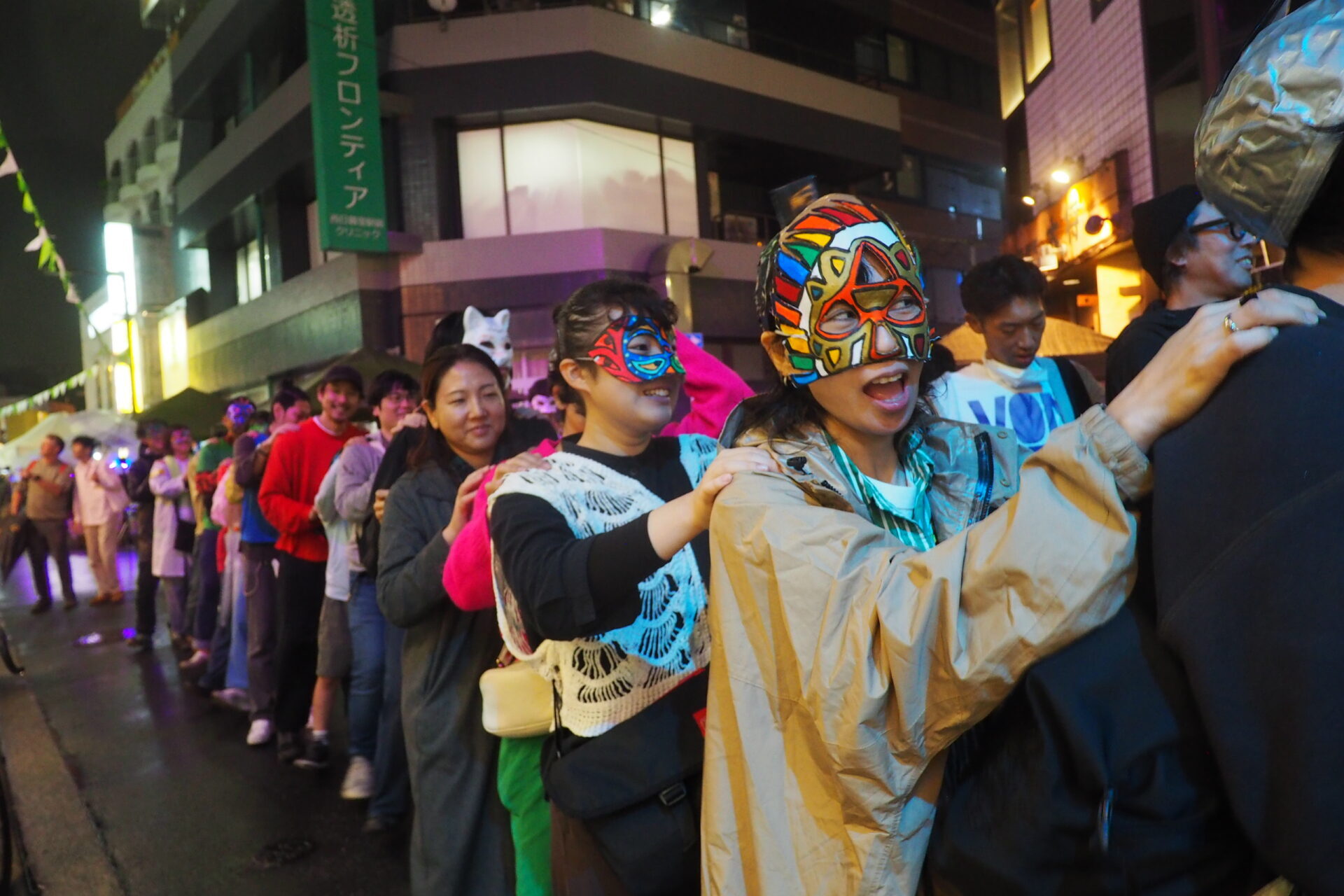 今回から駅出口前に広がる会場の入口空間をプロムナードに見立て、固定のテントを設置しない代わりに、道路で過ごすきっかけとなるような可動式什器を製作しました。道路沿いに点在するボラードに巻き付けただけのテーブルでご飯を食べるお客さん。ビールコンテナをベルトで巻いただけの移動式屋台で、お面を売りながら練り歩く商人。元から沿道にあるものにひと工夫加えるだけで、いつもの景色にすっと馴染みつつ、いつもより活発な道路の表情を見ることが出来ました。