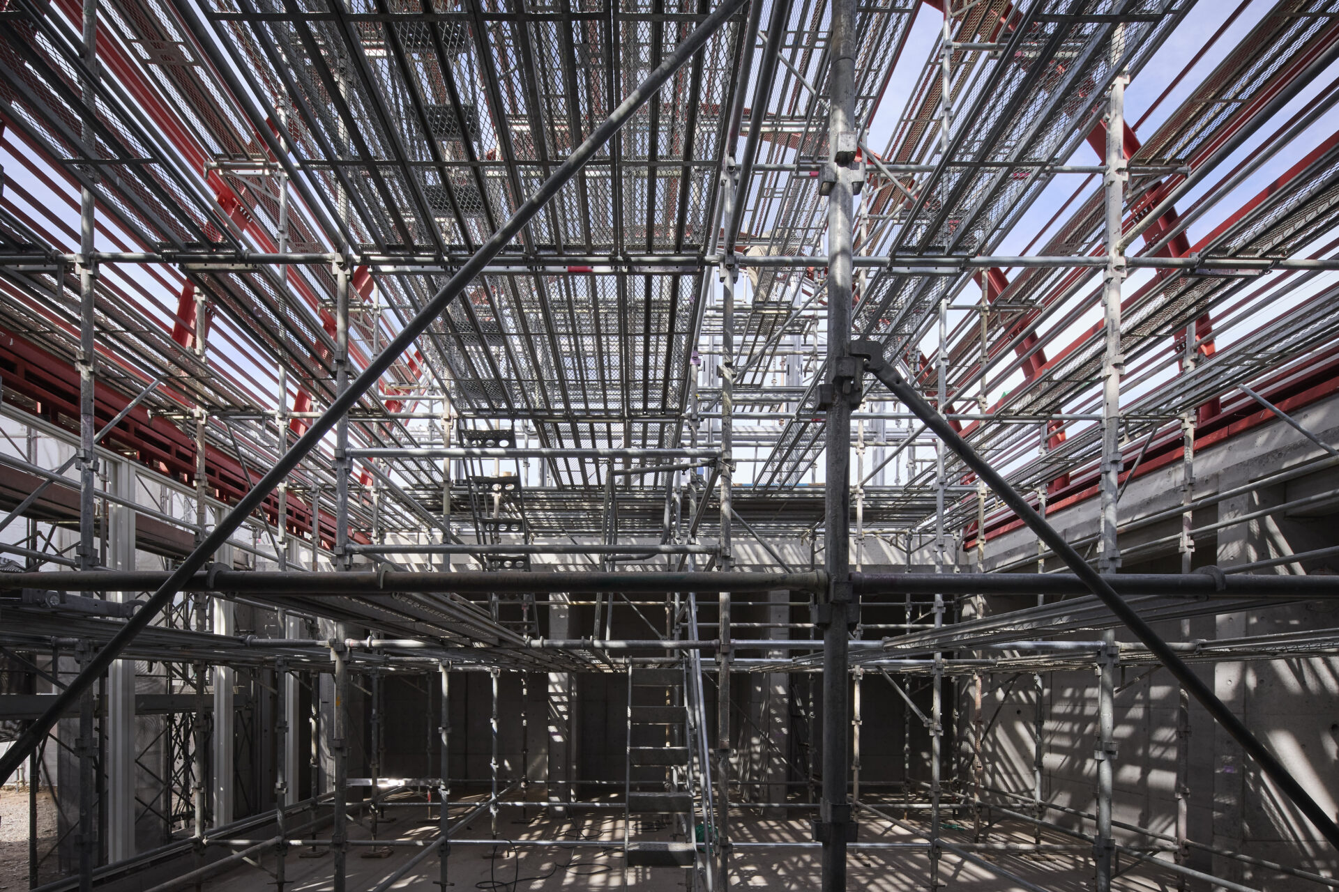 一方で現在に至るまで、利根川や広瀬川を中心に畑地として利用されてきた土地はやがて現在進行中の区画整理事業を機に前橋の郊外として今もなお多くの住宅が建設され、高速道路が横切っている。本敷地はまさに現代と中世と古代がせめぎ合う土地である。これらの敷地的特徴から、古代の基壇と、中世の屋敷林と、現代の高速道路のもつ直線性をハイブリッドした要素による建築構成とした。