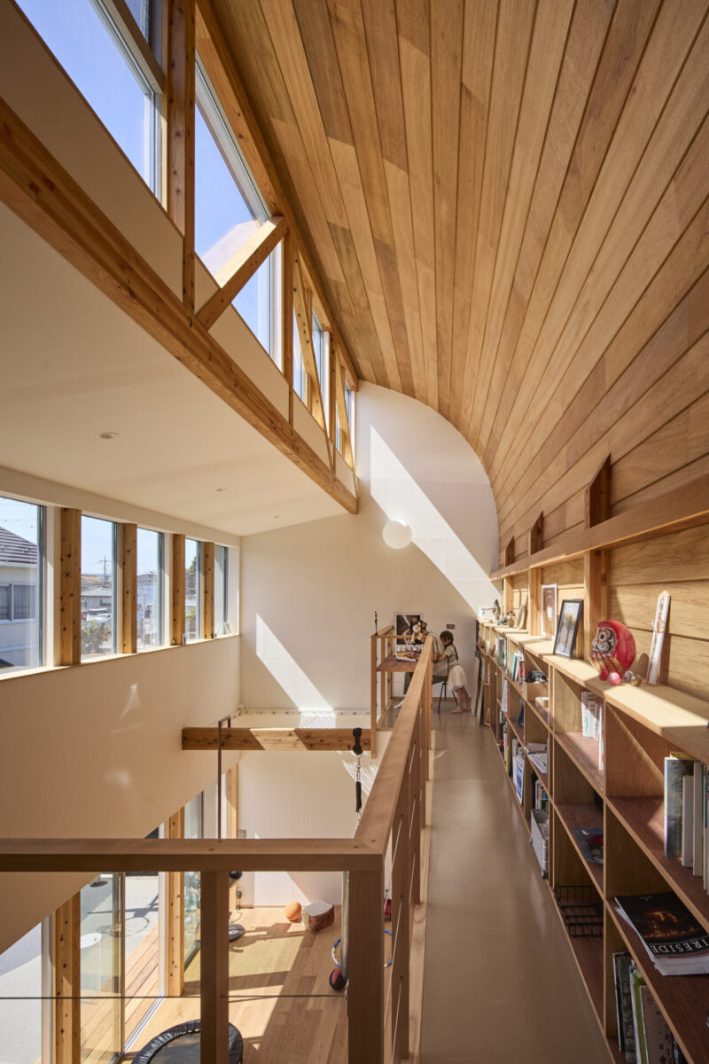 家族の時間と建築の時間をどう折り合わせるかをテーマにした住宅です。前橋駅近くの住宅街に建ち、夫婦と5人の子どもからなる7人家族の暮らしを包み込みます。北関東特有の「からっ風」を避けるように中庭を囲む曲面の外壁をもち、その内側に体育館のような大空間「アリーナ」を配置しました。季節ごとの光や風を受け止めながら、家族の変化をおおらかに受け入れる構成です。住宅を「住むための機械」ではなく、家族と地域の時間をやわらかく包むエンベロープとして構想しています。